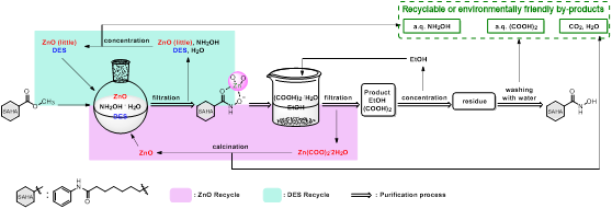 包雪飞/陈国良课题组首次报道了一种不需要使用碱的羟胺解方法。该方法的显著特征是以氧化锌为反应促进剂和产物分离沉淀剂,在生物来源的深共晶溶剂(DESs)中反应。在后处理过程中,作者还设计了产物纯化和试剂回收的综合解决方案,提高了资源利用效率,降低了过程质量强度(PMI)和废弃物强度(WI)。。通过该本方法,以59% ~ 95%的收率合成了各种类型的异羟肟酸衍生物24个,值得关注的是,光学纯的α-氨基酸酯可通过该方法转化成相应的异羟肟酸化合物,并保持了立体构型。此外,以抗肿瘤药物伏立诺他的合成为例在克级水平进行了连续四个批次的实验,验证了后处理流程的可行性,以及氧化锌和DESs的可回收性。