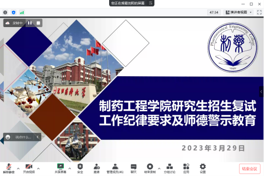 学院党委副书记刘阳为全体参加研究生复试工作的教职工做研究生招生复试工作纪律要求及师德警示教育。刘阳为参会老师介绍了复试纪律要求,她指出,在研究生复试工作中,全体老师要切实提高政治站位,切实增强纪律和规矩意识,共同营造风清气正的考试氛围;要切实认真干净履行职责,确保研究生招生复试各个环节安全有序;要切实加强各环节监督检查,严肃执纪问责。刘阳介绍了四个违反师德师风典型案例,引导学院教职工提高规则意识、底线意识,坚持立德树人,坚守为党育人、为国育才的初心和使命,努力为学校、学院发展贡献力量。