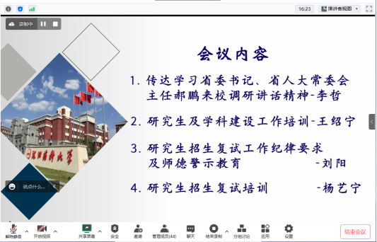 学院研究生辅导员杨艺宁为全体导师作2023年硕士研究生复试培训,她结合《beat365中文官方网站2023年硕士研究生复试录取办法》,从考核方式、复试内容、调剂要求、录取办法等方面为导师们进行介绍。