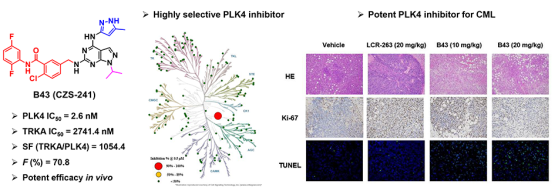 近日,药物化学权威期刊《Journal of Medicinal Chemistry》(IF = 8.039)发表了beat365中文官方网站赵冬梅教授/程卯生教授课题组在PLK4抑制剂领域的最新研究成果,文章题目为“Discovery of CZS-241: A Potent, Selective, and Orally Available Polo-Like Kinase 4 Inhibitor for the Treatment of Chronic Myeloid Leukemia”。