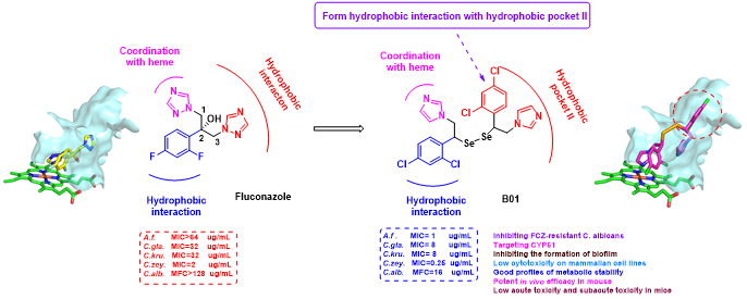 为提高抗真菌活性并解决耐药问题,课题组结合CYP51蛋白晶体结构,以氟康唑为先导化合物,采用柔性二硒醚为连接臂,创新性地引入双疏水性尾端,希望充分占据CYP51蛋白的疏水通道II,以提高化合物的抗真菌活性。活性研究结构表明,目标化合物具有比氟康唑更强的体外抗真菌活性。其中,化合物B01的体外抗真菌活性为氟康唑的4-64倍,并且表现出抗耐药真菌活性、杀菌活性和抗生物被膜活性。此外,化合物B01还具有较高的代谢稳定性、低细胞毒性和低溶血作用等特点。化合物B01腹腔注射给药可明显降低系统性白色念珠菌感染小鼠的肾脏载菌量,具有良好的体内抗真菌活性,还表现出了较低的急性毒性和亚急性毒性。分子对接结果显示氟康唑的三氮唑仅作用于CYP51蛋白疏水通道II的浅部区域,而化合物B01新引入的双疏水尾端可占据疏水通道II的浅部区域和深部区域,从而表现出更优的活性和抗耐药真菌活性。本研究创新地引入双疏水性尾端,为新型抗真菌药物的发现提供了新的思路。