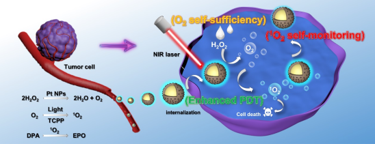 TCPP@DPA-MOF-Pt纳米平台在光动力治疗过程中通过O2自给和实时1O2自监测实现增强PDT的功能机制示意图
