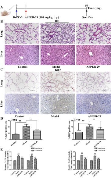 图3. ASPER-29 suppressed pancreatic cancer metastasis in vivo. (A) The construction of a tail vein metastasis model. Human BxPC-3 cells were injected into the tail vein of each mouse. One day later, ASPER-29 (100 mg/kg) was intragastrically administered once daily for eight consecutive weeks before perfusion. (B) Representative hematoxylin and eosin–stained sections of metastasis in liver and lung are shown. Original magnification: 200 × . (C) Representative IHC images displaying Ki67 expression and quantitative data in lung and liver tissues. Original magnification: 200 × . (D) Representative IHC images displaying CEACAM6 expression and quantitative data in lung and liver tissues. Original magnification: 200 × . (E) Relative CAT-L and CAT-S activities were evaluated by a BioVision’s CAT-S or CAT-L Activity Assay Kit in lung and liver tissues. The data are presented as the mean ± SD (n = 6 per group). #p < 0.05, ##p < 0.01 vs. control group; *p < 0.05, **p < 0.01 vs. model group.