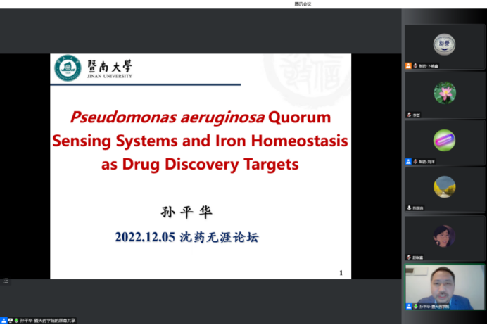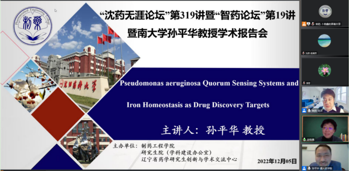 2022年12月5日下午,beat365中文官方网站、研究生院、辽宁省药学研究生创新与学术交流中心联合举办了“沈药无涯论坛”第319讲暨“智药论坛”第19讲,暨南大学孙平华教授作了题为“Pseudomonas aeruginosa Quorum Sensing Systems and IronHomeostasis as Drug Discovery Targets”的报告。会议由制药工程学科副主席刘洋教授主持,学院领导班子成员、全院研究生导师和研究生共300余人参会。
