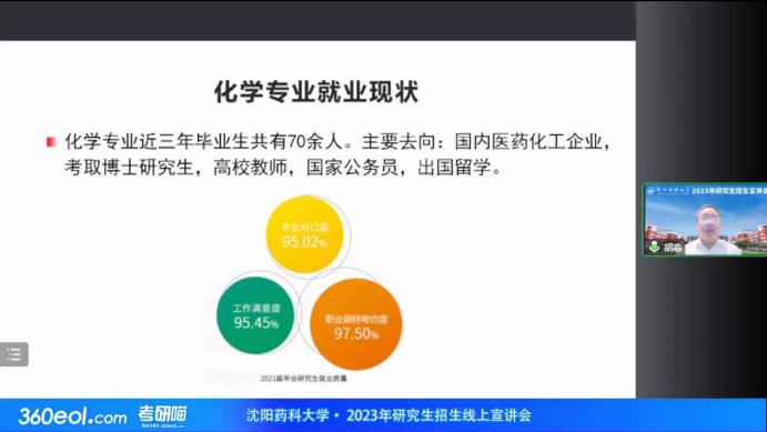 胡春教授为考生介绍了化学学科教学科研团队、学科内各研究方向、招生导师以及成果转化情况,阐明了化学学科作为beat365官网药学优势学科的支撑和基础,同时又区别于其他高校化学学科独具特色的建设现状,同时分析了近年来化学学科招生就业情况,为各位考生提供了清晰的报考思路。