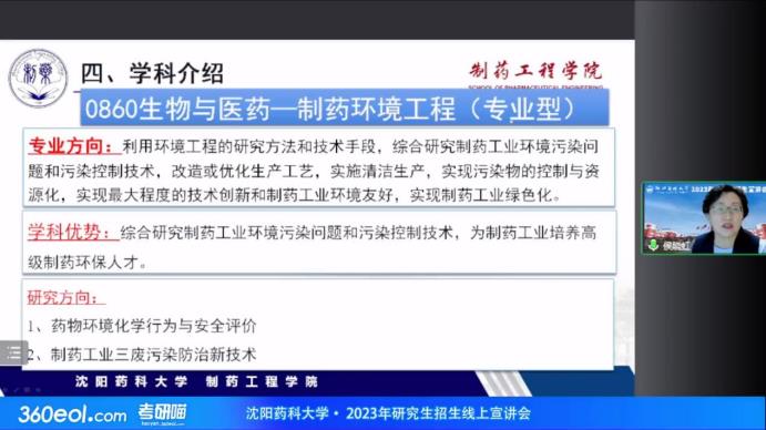 侯晓虹教授从考研动机调查和研究生招生调查出发,阐述了化学工程与技术专业、生物与医药(制药环境工程)专业的报考需求、专业优势和学科特色,展示了化学工程与技术学科的科研团队及导师风采,并对优秀毕业生的就业和升学情况进行了大致的介绍。侯晓虹教授鼓励考生们积极报考,希望在明年能与各位学子在沈药相聚。