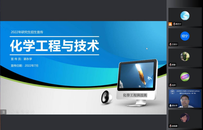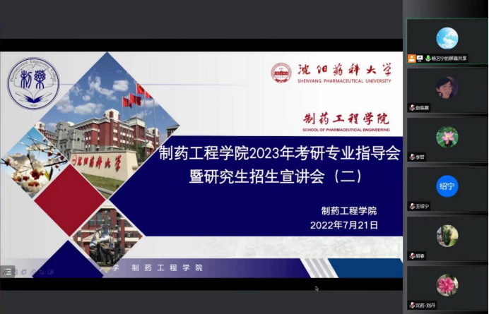 本次会议邀请了药物化学系主任刘丹教授、制药工程学科副主席刘洋教授、化学学科主席胡春教授、化学工程与技术学科副主席郭永学教授进行了对应分科的招生宣讲,从专业角度为有考研意愿的同学带来权威的考研解读,为考生们线上答疑解惑,助力同学们考研方向选择。同时,会议特别邀请了研究生院学位管理科科长杨亚明老师为参会同学做出招生政策方面的解答。学院领导班子全体成员参加了本次会议,会议由研究生辅导员杨艺宁主持。
