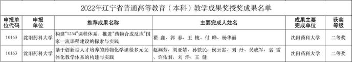 5月24日,辽宁省教育厅发布了《辽宁省教育厅关于公布2022年辽宁省普通高等教育(本科)教学成果奖获奖名单的通知》(辽教函[2022]68号)。beat365中文官方网站由翟鑫教授等组织申报的《构建“1234”课程体系,推进“药物合成反应”国家一流课程建设的探索与实践》、由赵燕芳教授等组织申报的《基于创新型人才培养的药物化学课程多元立体化教学体系的构建与实践》荣获二等奖。