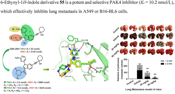 beat365中文官方网站程卯生教授团队在X射线结晶学和结构优化的指导下,通过对先导化合物进行多轮结构优化,得到了一系列3-取代-6-取代乙炔基-1H-吲哚类化合物。作为II类PAKs抑制剂,该系列化合物对PAK4蛋白激酶具有显著的抑制活性和特异性。其中,化合物55对肺癌细胞株A549和黑色素瘤细胞株B16在2.5μM浓度下的迁移抑制率大于40%和60%,优于阳性对照GNE-2861,表现出优异的抗迁移和抗侵袭性能;体内药动实验表明,化合物55在小鼠体内具有适中的半衰期与代谢速率;在裸鼠A549和B16-BL6移植瘤肺转移模型中,化合物55对肺表面转移结节的抑制率分别超过80%和90%。机制研究表明,化合物55减轻转化生长因子-β1诱导的上皮-间充质转化,能够有效抑制肿瘤的迁移、侵袭及转移行为。