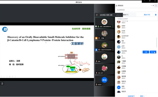 随后,王爽对2021年发表在《Journal of Medicinal Chemistry》的文章(2021, 64, 12109−12131)《Discovery of an Orally Bioavailable Small-Molecule Inhibitor for the β Catenin/B-Cell Lymphoma 9 Protein−Protein Interaction》中的生物活性测试及作用机制研究进行了详细解读,帮助理解这些试验的原理和目的。