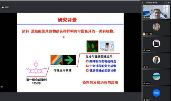 学术报告会上,陈小强介绍了传统染料所衍生的功能探针作为分子工具在环境监测、生物成像与医学诊疗等领域中发挥的重要作用;分享了课题组近年来以传统染料为母体,通过分子结构设计赋予染料新的功能,并拓展染料在传感与成像领域的应用等科研工作,主要包括基于化学反应触发的功能染料在生物传感与成像领域的应用和基于光触发螺吡喃染料在流体表面温度场及流型成像领域的应用。