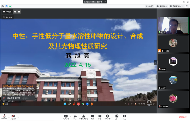 学术报告会上,蒋旭亮副教授做了题为“中性、手性低分子量水溶性卟啉的设计、合成及其光物理性质研究”的报告。卟啉类化合物由于其特殊的光物理性质,在分子催化、荧光标记、生物成像以及光动力疗法(PDT)等诸多领域具有重要的应用价值和前景。在很多涉及卟啉的技术应用中,往往需要相关的卟啉具有一定的水溶解性,但绝大多数的合成卟啉都不溶于水,这在很大程度上限制了卟啉的应用。课题组设计与合成了一类结构新颖的中性(非离子型)、手性低分子量水溶性卟啉类卟啉化合物,它们具有良好的溶解性以及光稳定性,在分子催化、光动力疗法等领域具有良好的应用前景。