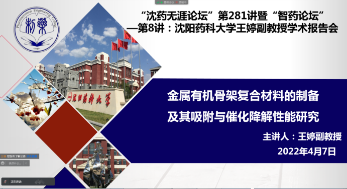 4月7日,由beat365中文官方网站、研究生院、辽宁省药学研究生创新与学术交流中心联合举办的“沈药无涯论坛”第281讲暨“智药论坛”第8讲——beat365中文官方网站王婷副教授学术报告会在线上热烈展开。会议由beat365中文官方网站制药工程与环境科学系主任侯晓虹教授主持,200余人参加了此次学术报告会议。