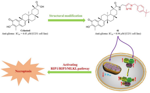 课题组以雷公藤红素为母体化合物,应用点击化学策略设计了两类雷公藤红素三氮唑衍生物,对5种胶质瘤细胞进行活性筛选。最优化合物6i对U251的IC50值为0.94 μM,其抗增值活性比雷公藤红素提升4.7倍。机制研究表明,该化合物可通过激活RIP1/RIP3/MLKL通路从而引发细胞程序性坏死最终导致肿瘤细胞死亡。在斑马鱼U251细胞系的异种移植模型中,化合物6i表现出有效的抗神经胶质瘤活性。