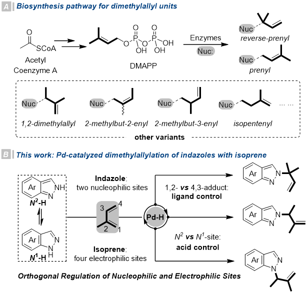 二甲基烯丙基单元是普遍存在于天然和生物活性化合物中的五碳骨架,这些基团的存在通常对增强分子的亲脂性和促进分子的跨细胞膜渗透具有重要作用。因此,将这些基团高效地组装到重要分子框架中是有机化学和药物发现领域的重要研究课题。在自然界中,二甲基烯丙基焦磷酸酯(DMAPP)可通过酶催化的生物合成来组装异戊烯基和反异戊烯基分子片段,但它们的异构体比较少见。蒋旭亮副教授课题组采用正交调控策略实现了钯催化的异戊二烯对吲唑的区域发散性偶联反应。