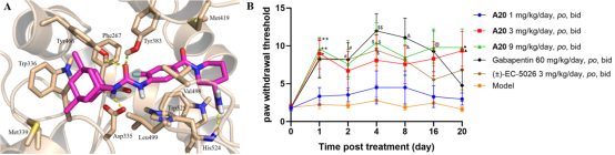 图1. (A) A20与sEH蛋白在活性腔中的模拟对接 (PDB code: 3WKE);(B) A20缓解坐骨神经分支选择性损伤大鼠的神经病理性疼痛。