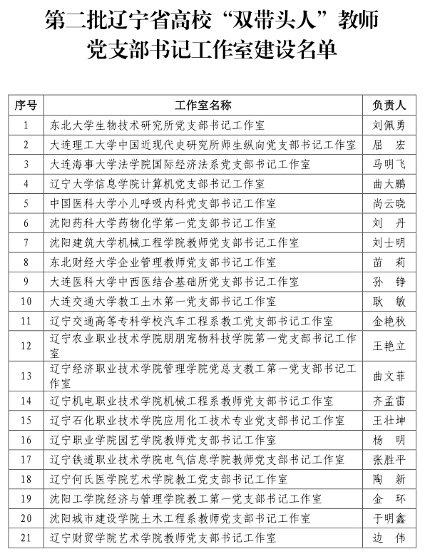 近日,辽宁省委教育工委办公室发布《关于公布第二批辽宁省高校“双带头人”教师党支部书记工作室建设名单的通知》,全省21个本、专科高校教师党支部工作室位列建设名单。其中,由药物化学教研室主任刘丹教授负责的beat365中文官方网站药物化学第一党支部书记工作室成功入选第二批辽宁省高校“双带头人”教师党支部书记工作室。