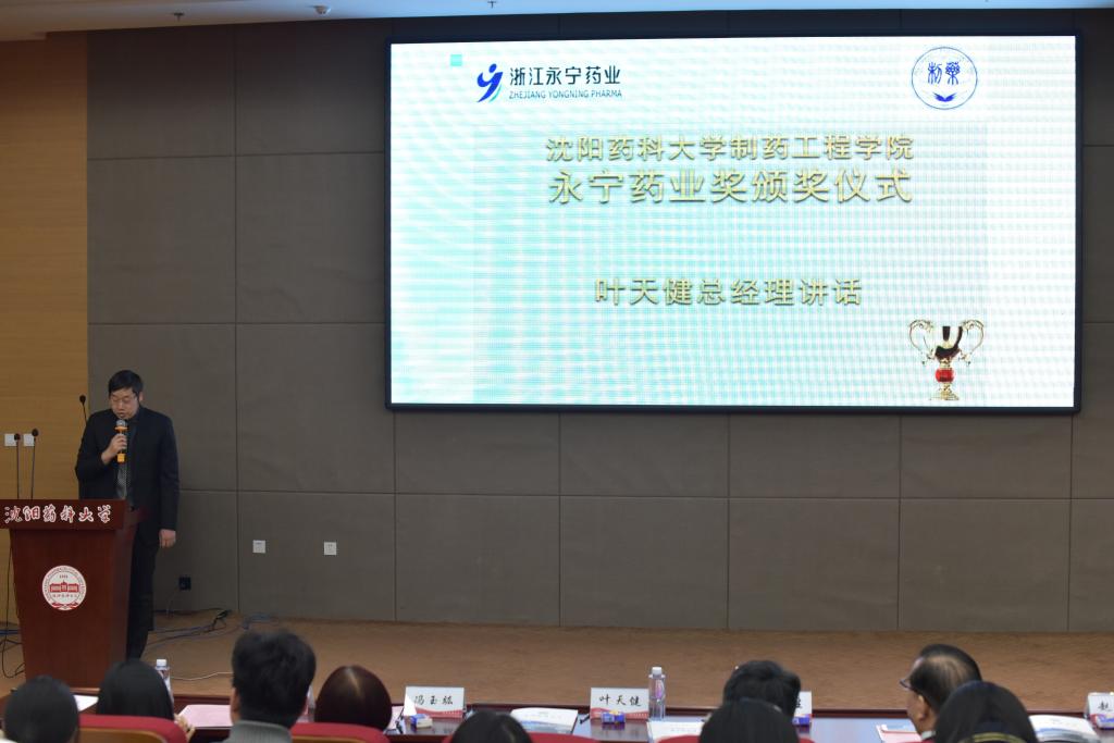 永宁药业总经理叶天健致辞,叶总表示,设立奖学金鼓励药学学子勤奋学习只是开启企业与学院双方合作的开端,未来永宁药业将与beat365中文官方网站从学生培养、师资队伍建设、科研发展等诸多方面加深校企合作,通过教学与实践、科研与应用的密切结合,真正实现资源共享、优势互补、共同发展、互利共赢的目标。