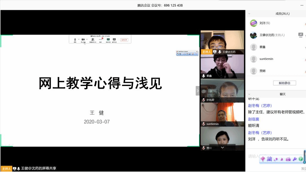 在组织全体教师进行线上授课教学的讨论后,由已经开展线上教学并取得较好教学效果的王健老师分享线上教学的相关经验。他结合自己联合使用爱课程平台+腾讯会议+QQ群+EV录屏等应用软件,开展直播授课的经验,介绍了线上教学中各种平台软件的使用技巧,强调与学生保持时时沟通对保证教学质量的必要性。随后,全体教师就直播授课、在线答疑、作业考核、师生互动等内容进行了交流。部分老师还提出了自己在准备线上教学过程中遇到的问题,多位老师及时予以解答或推荐解决办法。此外,对教研室负责的多门实验课程的教学手段和时间安排,也进行了相应的讨论。