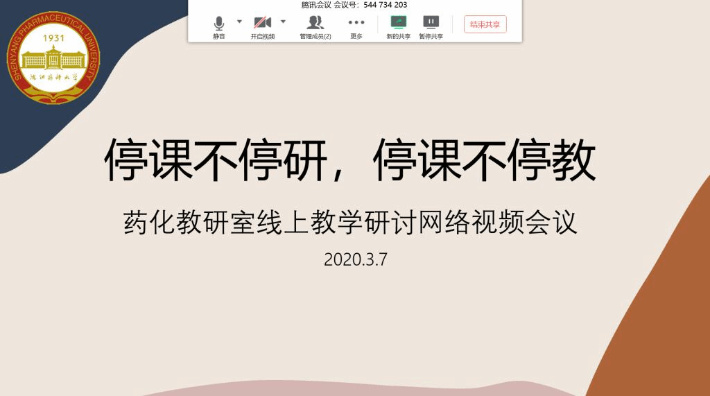 在新冠肺炎疫情防控工作的关键时期,beat365中文官方网站药物化学教研室积极响应教育部和校党委关于“停课不停教,停课不停学”的号召,于3月7日上午应用腾讯会议平台,召开网络视频工作会议,切实落实学校关于“扎实做好线上教学工作”的总体要求,研讨本科生理论课程网络教学的相关要点。会议由教研室主任刘丹教授主持,教研室26位一线教师全部出席会议。