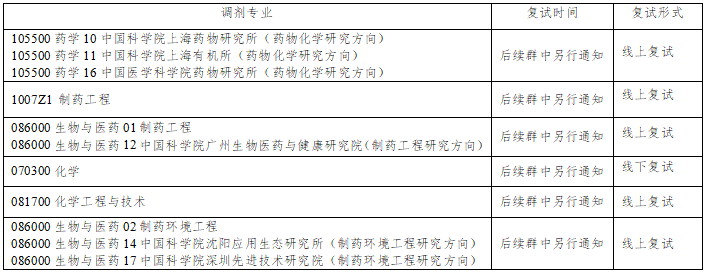 (一)复试专业代码及名称:100701 药物化学、1007Z1 制药工程、105500药学06药物化学研究方向、105500药学10中国科学院上海药物研究所(药物化学研究方向)、105500药学11中国科学院上海有机所(药物化学研究方向)、105500药学16中国医学科学院药物研究所(药物化学研究方向)、086000生物与医药01制药工程、086000生物与医药12中国科学院广州生物医药与健康研究院(制药工程研究方向)