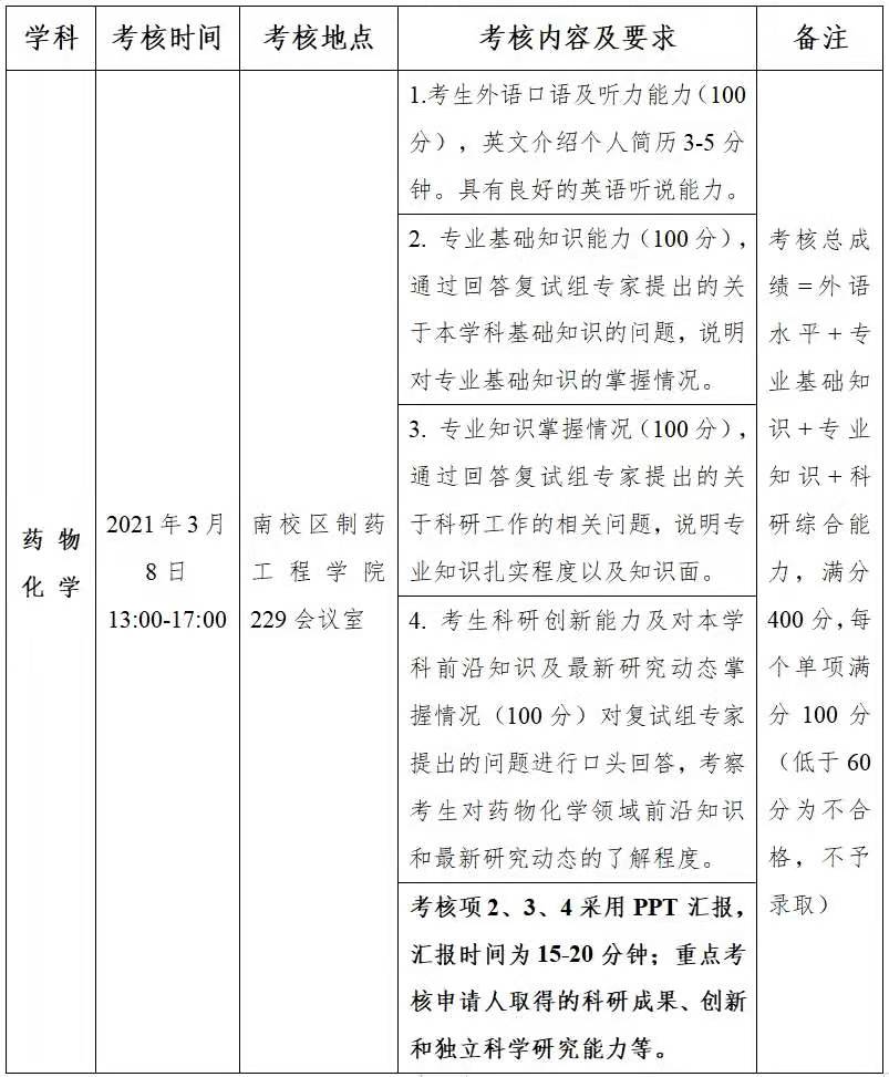 考核内容包括外语水平、专业基础知识、专业知识和科研综合能力四个模块,每个单项满分为100分,成绩低于60分为考核不合格不予录取。
