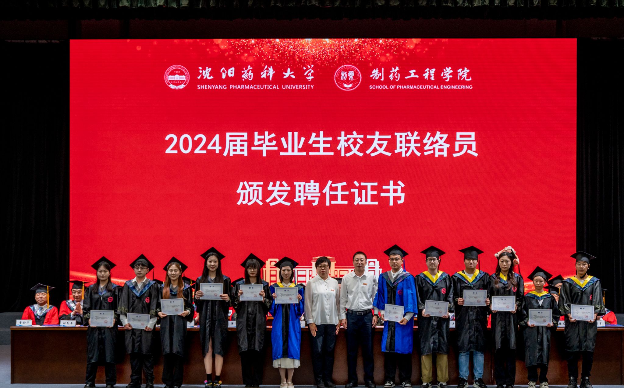 2024届毕业生即将离开母校奔向崭新的人生征程,由“沈药学子”转变成为“沈药校友”, 辽宁海思科制药有限公司总经理梁勇、院党委书记李哲为2024届毕业生校友联络员颁发了聘任证书。