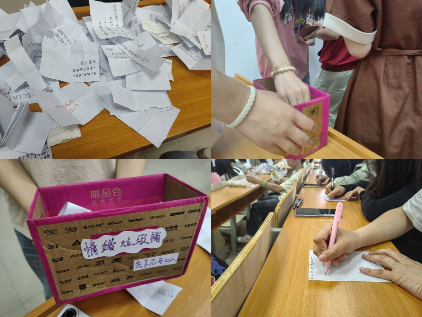 在活动中,同学们向“情绪垃圾桶”投递烦恼纸条,一同讨论解决办法,同时在“夸夸大爆炸”盒子中投递赞美纸条,传递温暖和正能量。通过互动交流,同学们积极探索如何面对学习生活中的烦恼和困扰,这不仅让同学们释放了自己内心深处的负面情绪,还帮助同学们培养良好的心理素质。通过本次活动,同学们加强了对心理异常的认知,学会调控负面情绪,认识到大学生心理健康的重要性和意义,不断培育自尊自信、理性平和、积极向上的健康心态。