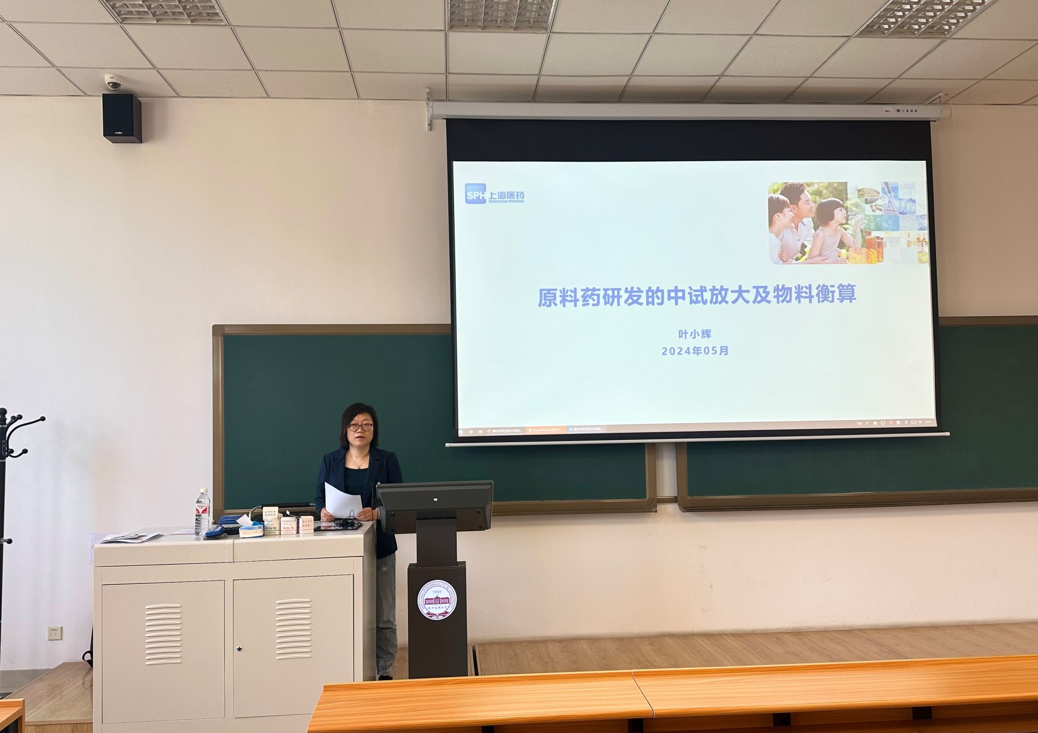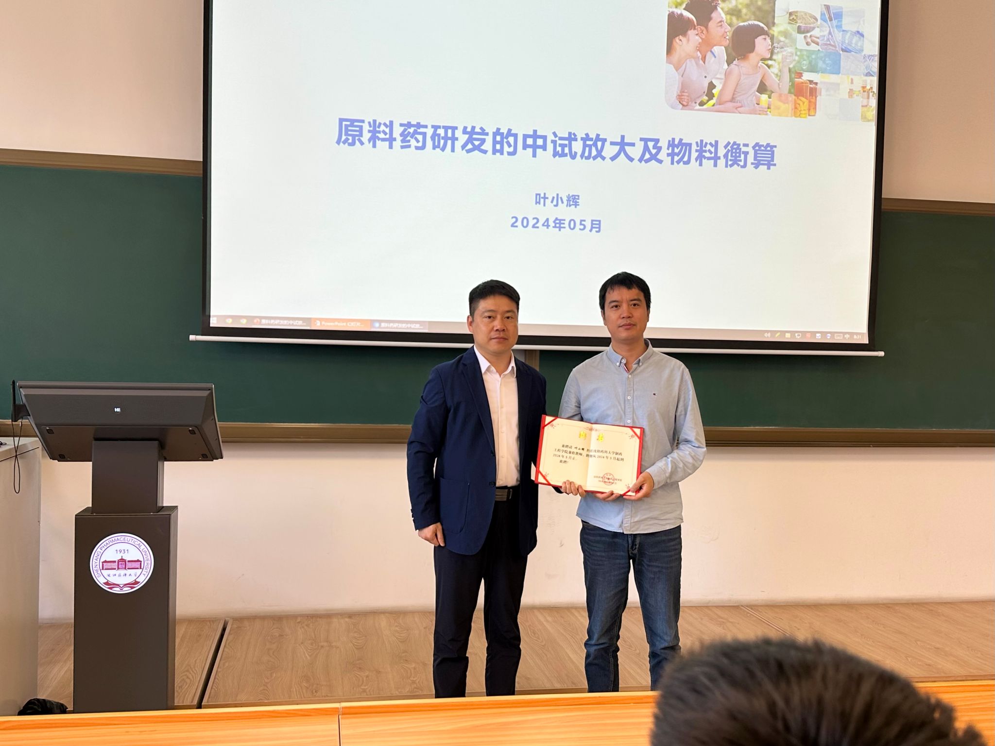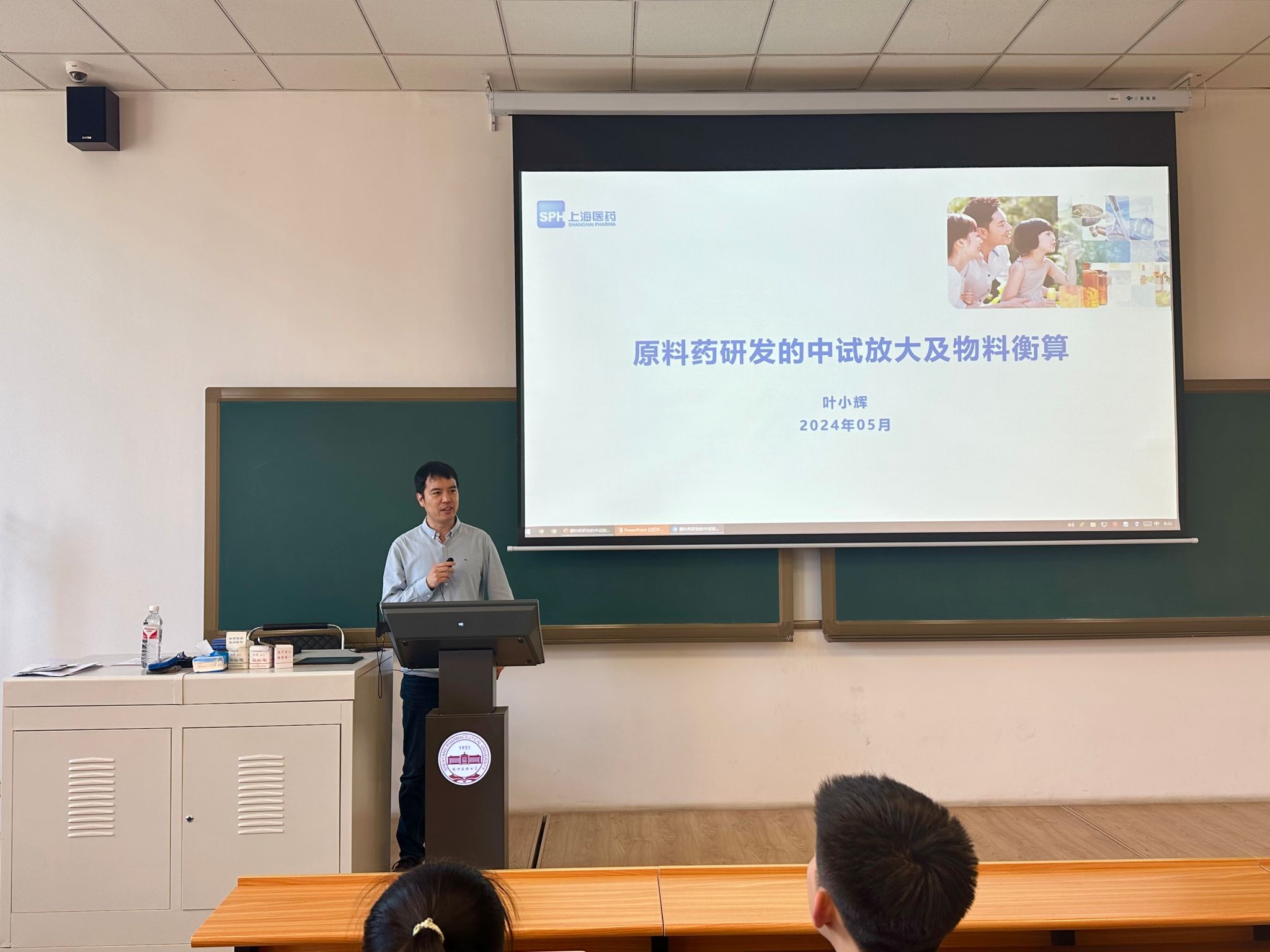 5月28日,beat365中文官方网站聘请上海医药集团(本溪)北方药业有限公司高级工程师叶小辉为兼职教师,并给88K制药工程专业的同学们进行《化学制药工艺学》课程授课,学院院长刘洋、副院长刘丹共同聆听了课程。