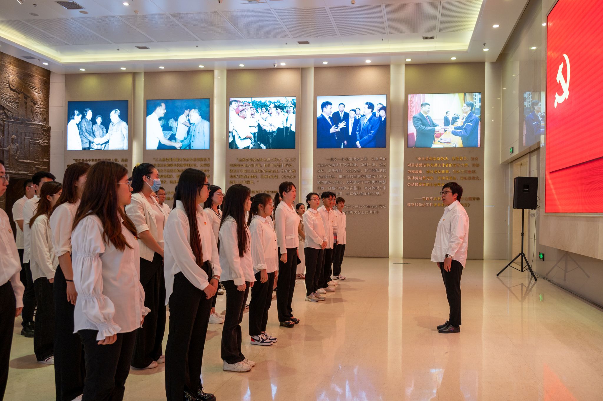 参观过程中,全体师生党员认真聆听讲解,驻足观看珍贵历史照片、实物陈设、雕塑等,一同走近了中国第一位女火车司机田桂英、抗击疫情最美逆行者李娜等劳动模范和集体的先进事迹,重温了沈阳英雄城市的光辉历史和广大劳模艰苦创业、不懈追求的奋斗历程,感受了他们以实际行动铸就的劳模精神,从中汲取勇往直前、接续奋斗的智慧和力量。