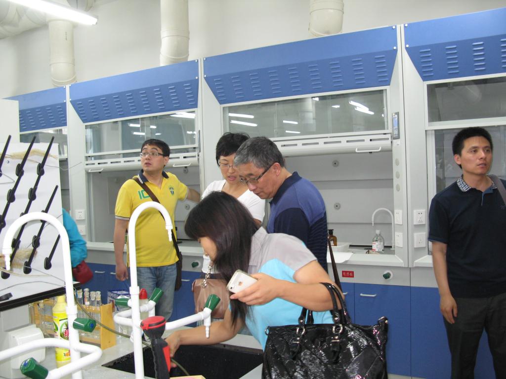 坐落在吉林大学前卫南校区的吉林大学理学部化学学院的化学实验中心是国家级首批实验教学示范中心,包括有无机化学基础实验室、有机化学基础实验室、分析化学基础实验室、物理化学基础实验室等。中心主任郭玉鹏教授、无机化学系主任、博士生导师张萍教授和中心魏士刚副主任热情迎接了前往考察参观的全体成员,向大家介绍了实验中心的建设状况、特色优势、发展定位以及总体规划等,并且引领大家到各个楼层的实验室、准备室和资料室等,亲临有机化学实验考试现场和分析化学设计实验课堂,体验这里的学习氛围和教学风格。在热烈而真诚的气氛中两校同行就实验教学现状和存在问题以及管理机制等诸方面进行了全方位多角度的研讨,王国清教授和郭春教授与张平教授和郭玉鹏教授还就实验教学中的学生素质教育进行了深入的交流。
